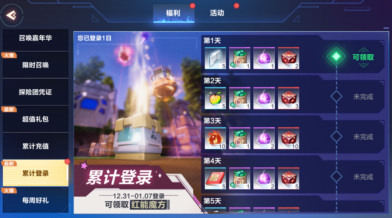 活动期间累计登录达到指定天数后可领取丰厚奖励,数据石、比特、强化材料等,第七天可领取变异的冰石蟹!登录七天合计可获得40个红能魔方!