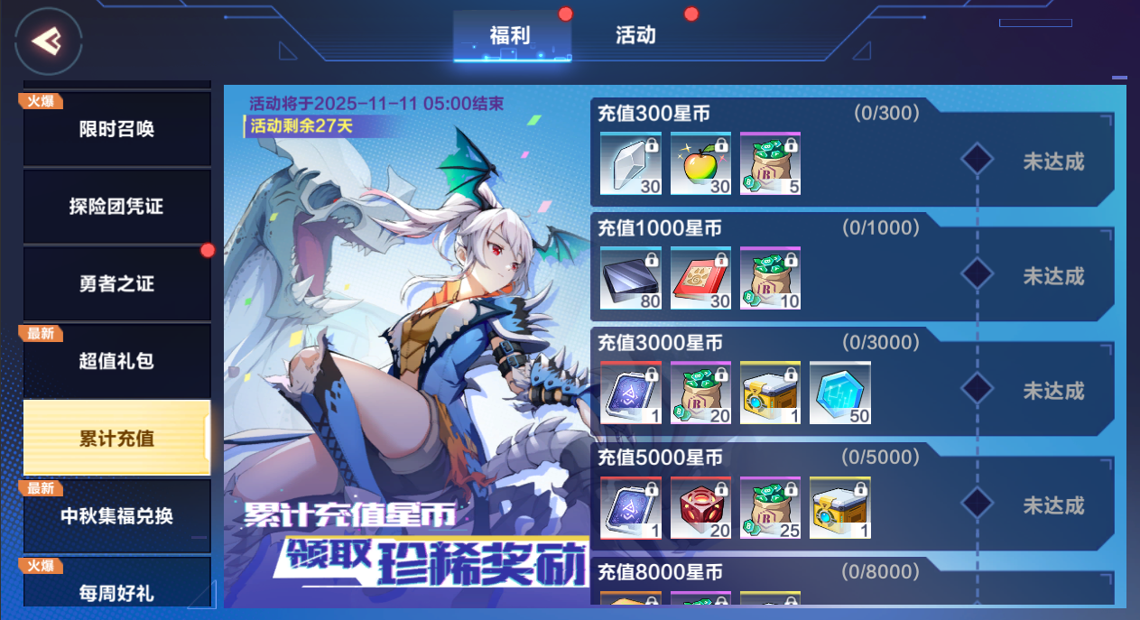 累计充值活动即将开启,助力探寻者们驰骋大陆。活动期间,每充值一定数量的星币将会获得一重豪华大礼,共有十重好礼相送!