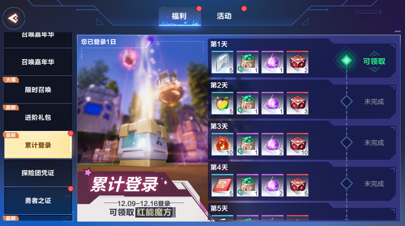 活动期间累计登录达到指定天数后可领取丰厚奖励,数据石、比特、强化材料等,登录七天合计可获得40个红能魔方!