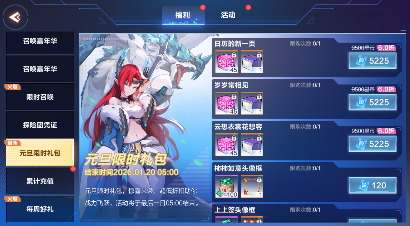 为了庆祝2026年的开启,我们为大家准备了大量超值折扣礼包。4折、2折,元旦限定称号和头像框、星能石、强化材料应有尽有,买到就是赚到!