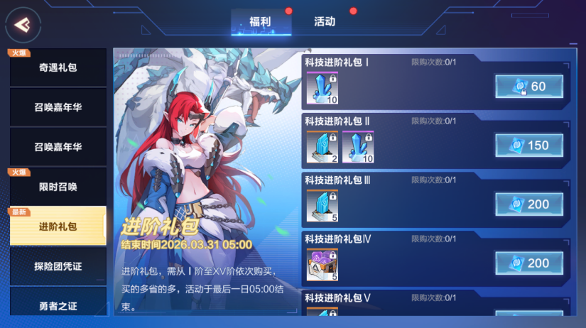 超值进阶礼包来了!购买1阶礼包后解锁2阶购买权限,可依次购买至10阶,越买越超值!