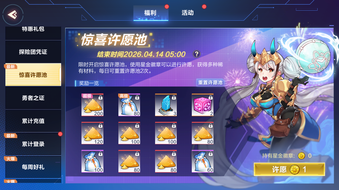 惊喜许愿池限时开启,商城开启星金徽章售卖,参与活动即可收获时光之尘、各种强化材料等大量奖励!许愿池每日最多可以重置两次哦!